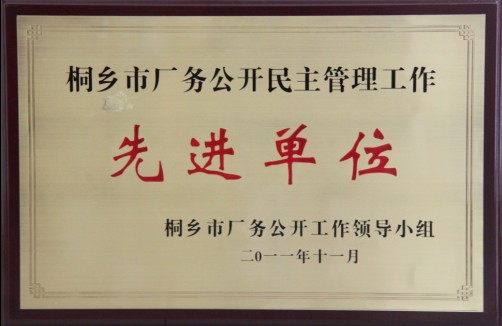 公司榮獲“桐鄉(xiāng)市廠(chǎng)務(wù)公開(kāi)民主管理工作先進(jìn)單位”稱(chēng)號(hào)