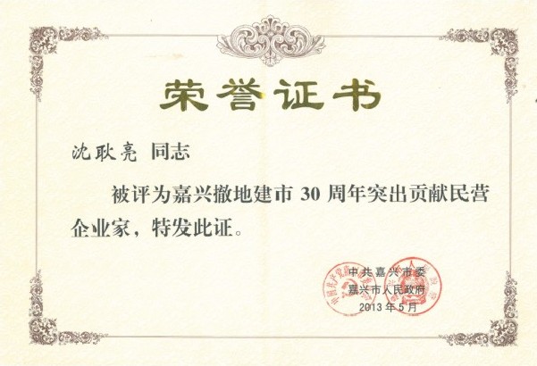 市委副書記高玲慧首先宣讀了市委、市政府《關(guān)于表彰嘉興撤地建市30周年民營企業(yè)發(fā)展先進集團和先進個人的決定》,市四套班子領(lǐng)導(dǎo)為獲獎企業(yè)和個人頒獎。公司董事長沈耿亮被授予“突出貢獻民營企業(yè)家”。