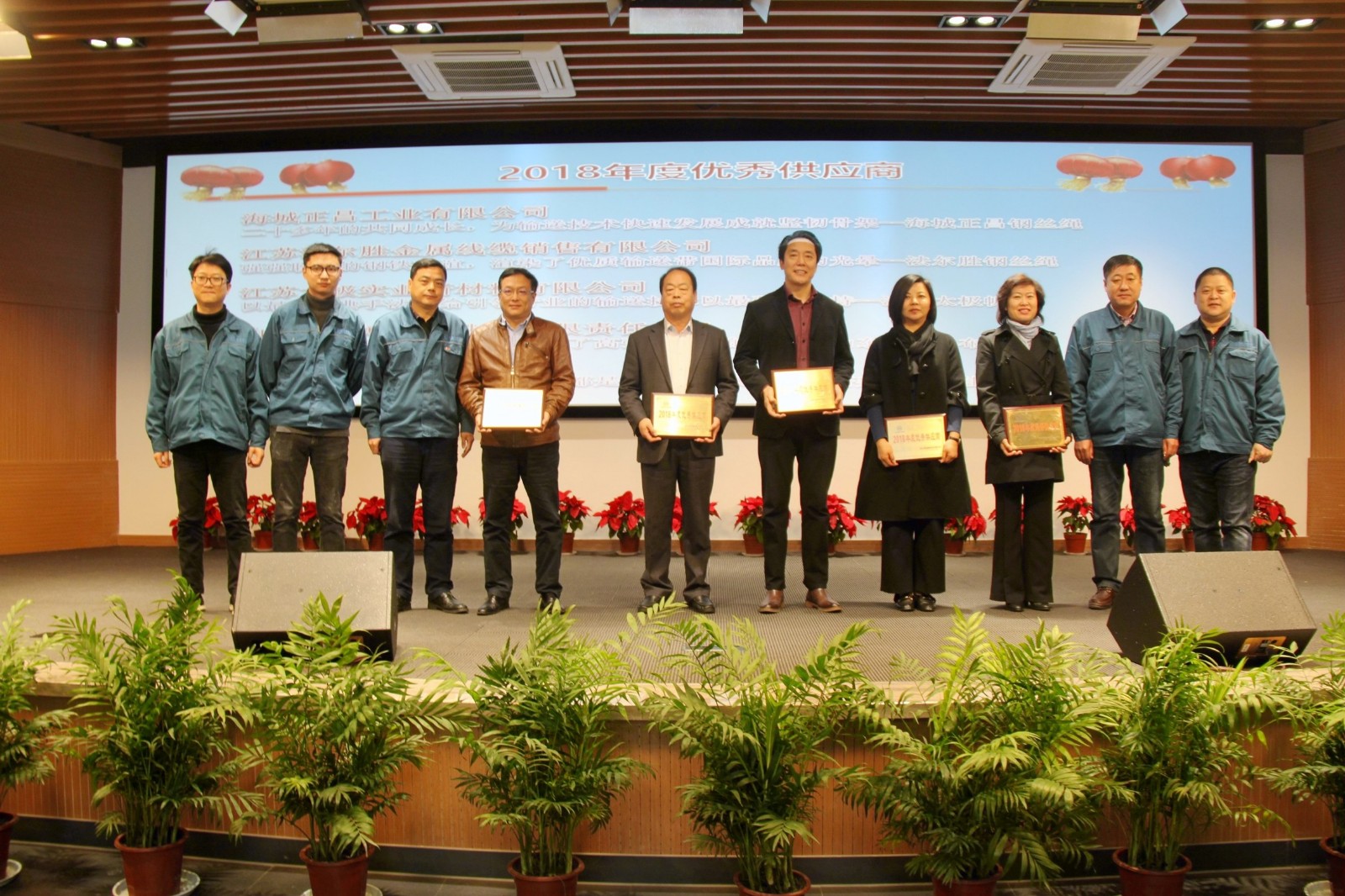 沈會(huì)民宣讀了2018年優(yōu)秀供應(yīng)商獲獎(jiǎng)名單,十家企業(yè)在去年一年的綜合業(yè)績?cè)u(píng)價(jià)中脫穎而出,獲得優(yōu)秀供應(yīng)商稱號(hào),公司高管為獲獎(jiǎng)供應(yīng)商代表頒發(fā)了獎(jiǎng)牌。